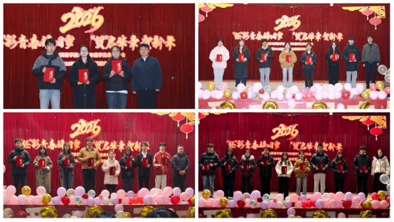 表彰大会落幕,元旦文艺联欢晚会精彩接续。开场舞蹈《最好的舞台》以灵动舞姿点燃现场气氛;歌曲《万水千山总是情》旋律悠扬,传递真挚情谊;武术《武贺新元》刚劲有力,展现中华武术魅力;《珊瑚颂》《爱的华尔兹》等舞蹈风格各异,尽显青春活力;话剧《咋咋呼呼》幽默接地气,引发全场共鸣;舞蹈串烧动感十足,将晚会推向高潮,最后合唱《相亲相爱》温情收尾。晚会穿插三轮抽奖环节,惊喜不断。领导和老师依次抽奖。获奖同学上台分享感慨与新年期许,真挚话语让现场暖意融融。