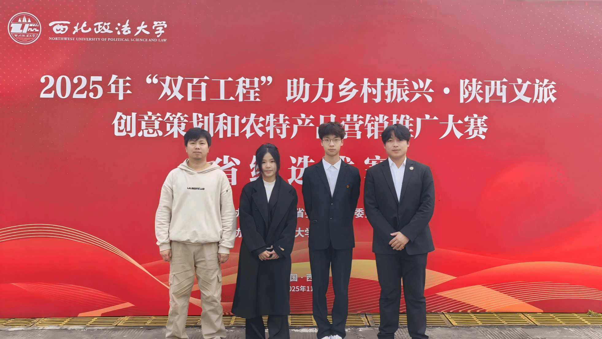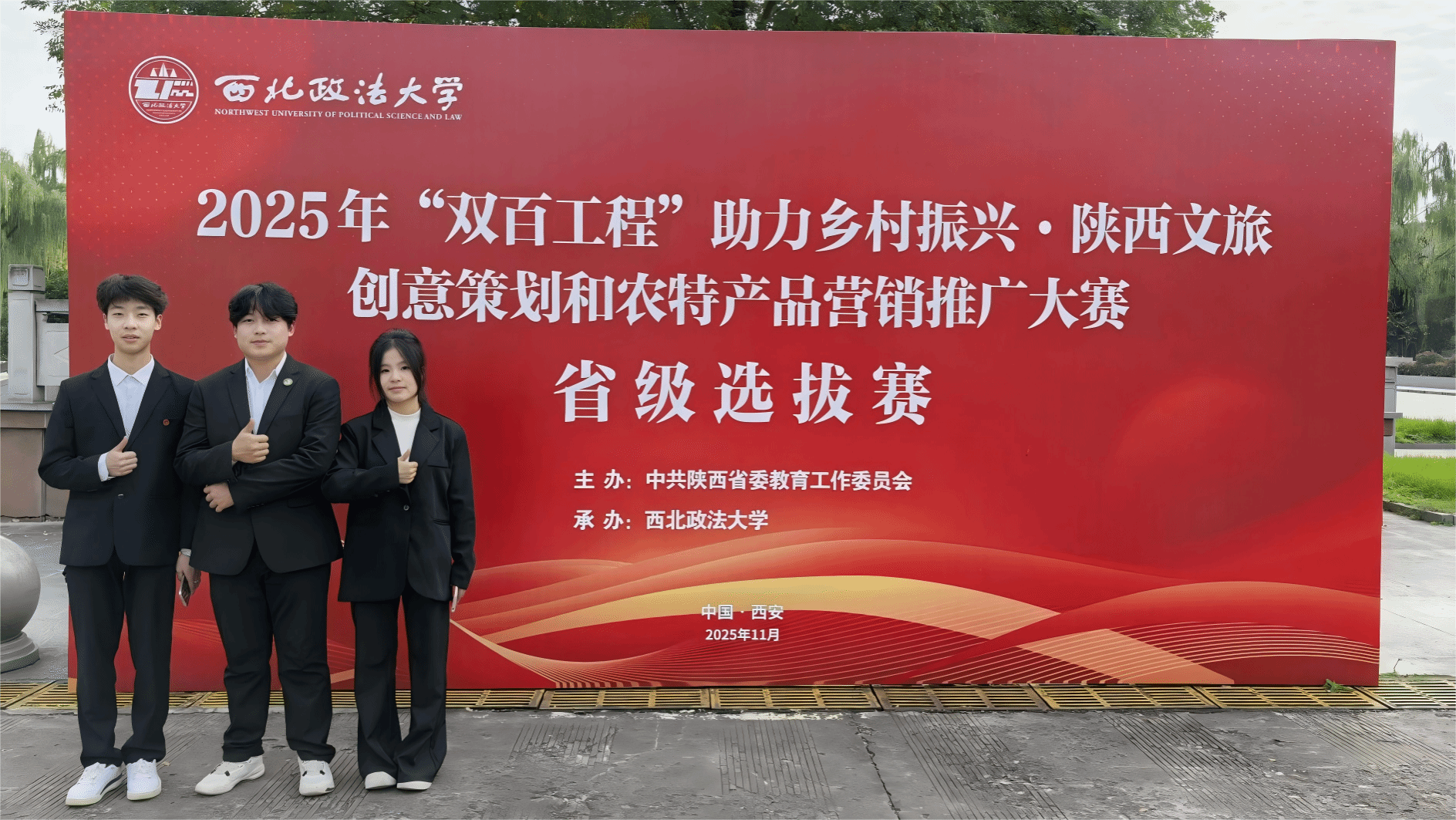 为深入落实陕西农特产品“双百工程”工作部署,搭建农特产品品牌推广与产销对接优质平台,11月8日,2025年“双百工程”陕西农特产品营销大赛省级选拔赛在西安政法大学举行。经济与贸易学院电子商务专业陈洋玲、刘可然、刘佩豪三位同学在帅景之老师的带队指导下代表我院参赛团队。团队凭借扎实的专业功底、创新的营销思路与亮眼的实践成果,从全省各高校参赛队伍中脱颖而出,成功晋级省级总决赛。
