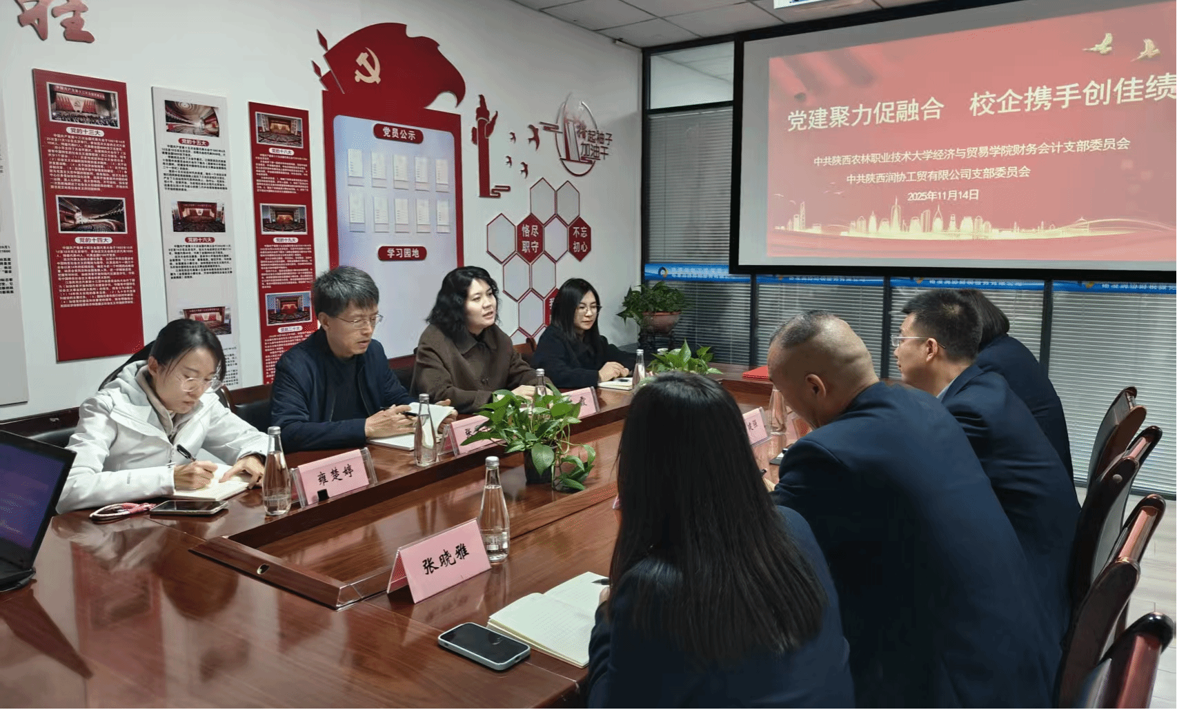 2025年11月14日,经济与贸易学院财务会计党支部与陕西润协工贸有限公司党支部举行结对共建签约仪式暨座谈交流会。双方以“党建引领聚合力,校企携手育人才”为目标,围绕支部共建、资源共享、人才培养等议题深入交流,为深化产教融合、服务学生成长搭建全新平台。经济与贸易学院党总支书记蒋霞、财会党支部书记张军平、副书记李青、组织委员雍楚婷参会。