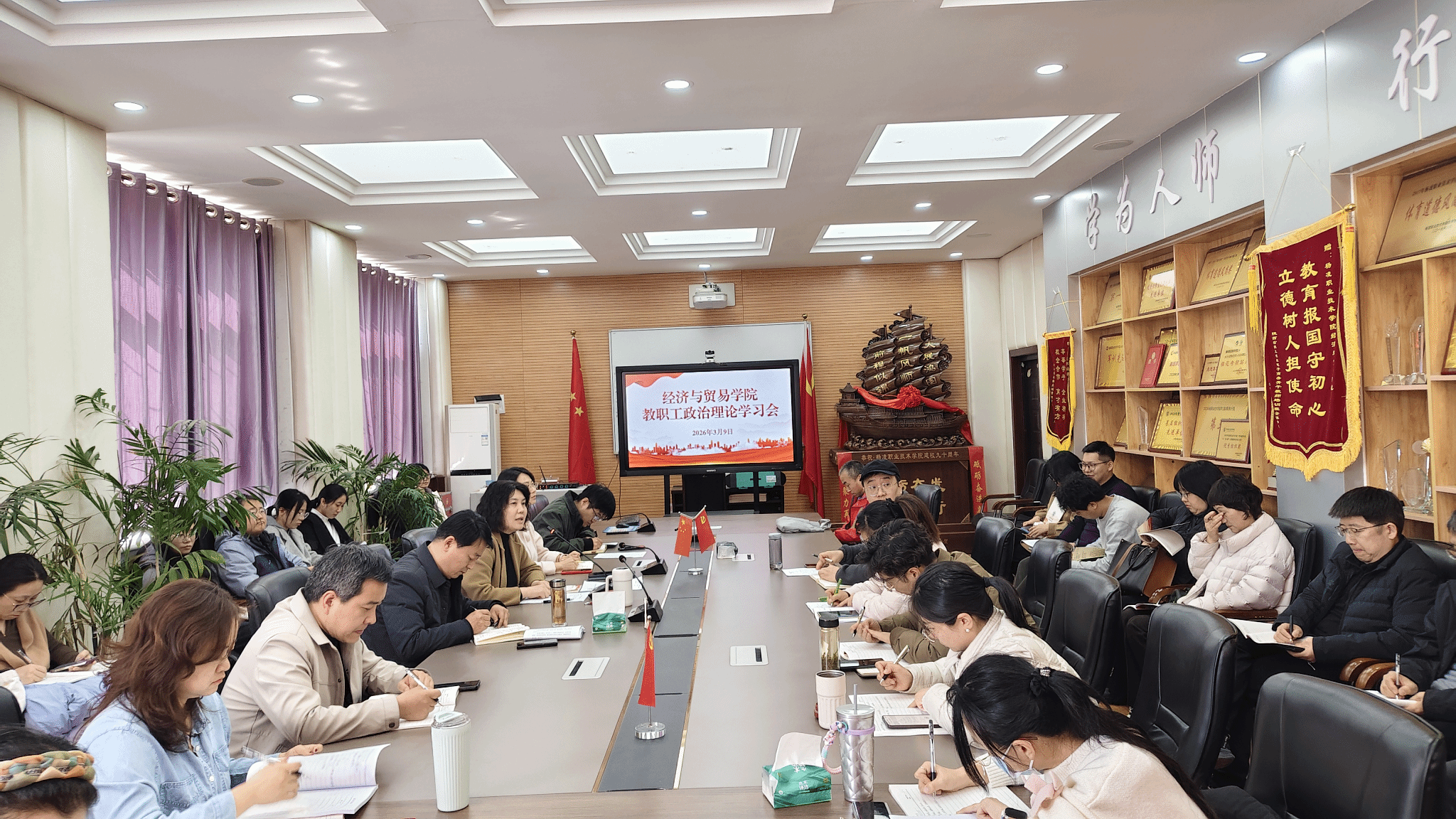 2026年3月9日下午,经济贸易学院党总支组织全体教职工开展政治理论学习。会议由党总支书记蒋霞主持。