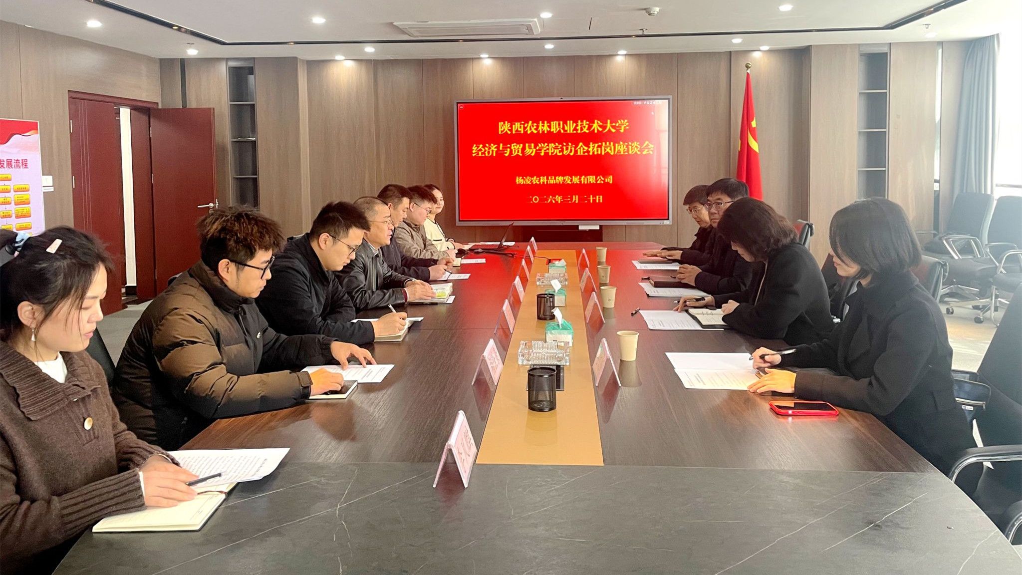 在杨凌农科品牌发展有限公司,双方聚焦电子商务、物流领域展开深度交流。刘瑞明介绍了学校办学特色,并结合专业布局介绍了电子商务、现代物流管理、大数据与会计等专业的培养特色及合作意向。企业说明了相关岗位需求与人才能力标准,双方就人才培养优化、专业设置调整、大赛实训共建、就业合作推进等方面达成共识,进一步明确了产教融合、协同育人合作方向。