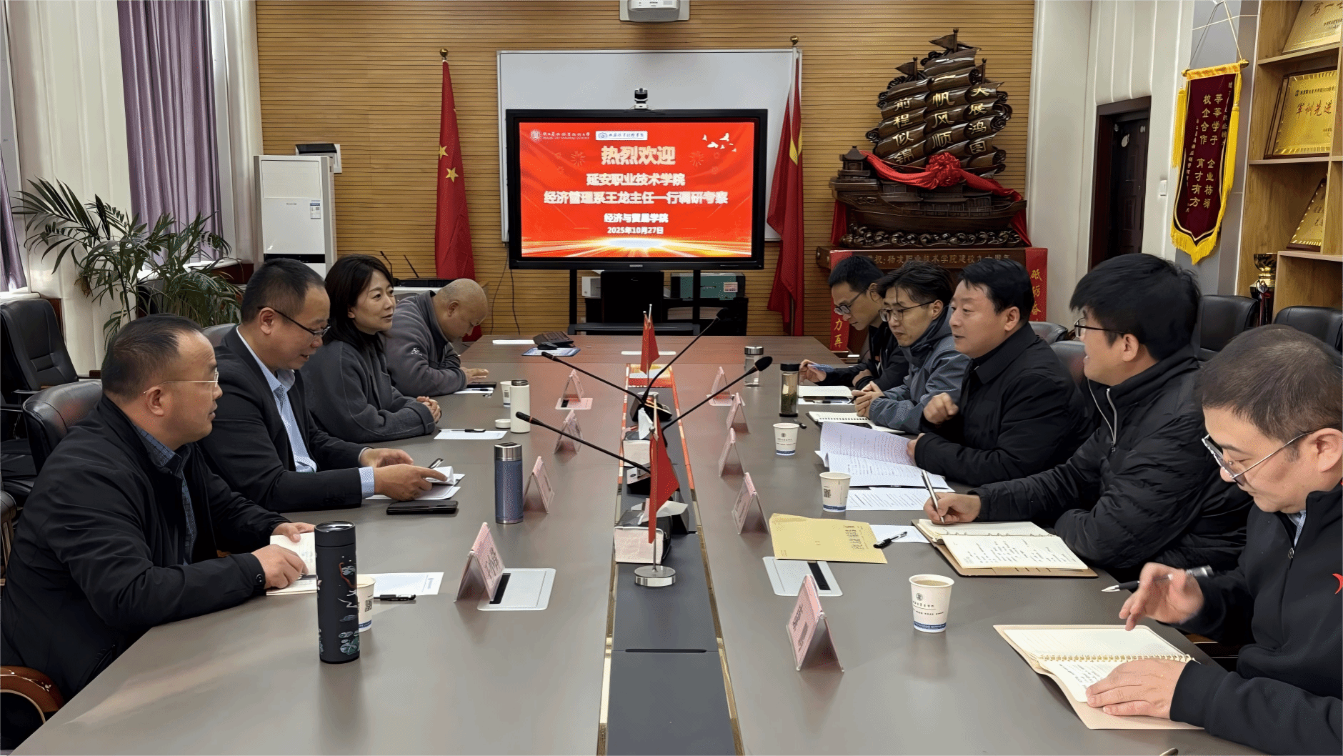 郑伟院长首先对王龙主任一行的到访表示欢迎,并就学院的基本情况,育人特色、电子商务专业群的建设成效等情况作了介绍。他表示,希望双方以此次交流为契机,在围绕行业发展、技术应用方面,就强化专业建设、提升教学水平,改善办学质量等方面与延安职业技术学院开展更深入的合作。王龙主任对我院专业建设成果给予高度赞扬。他表示,经贸学院就现代物流产业集群人才需求与职业教育资源匹配相关情况、经验做法具有很深刻的借鉴意义,为延安职院“十五五”高质量发展提供了重要参考。