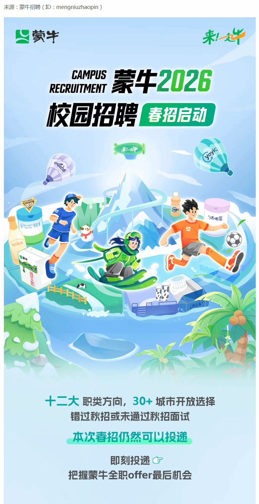 蒙牛2026春季校园招聘 2026年03月31日 次 https://mp.weixin.qq.com/s/T-adOIjjGQxAGeC8Y3jycA 上一篇:得物2026年春季校园招聘 下一篇:陕西省大数据集团有限公司社会公开招聘公告