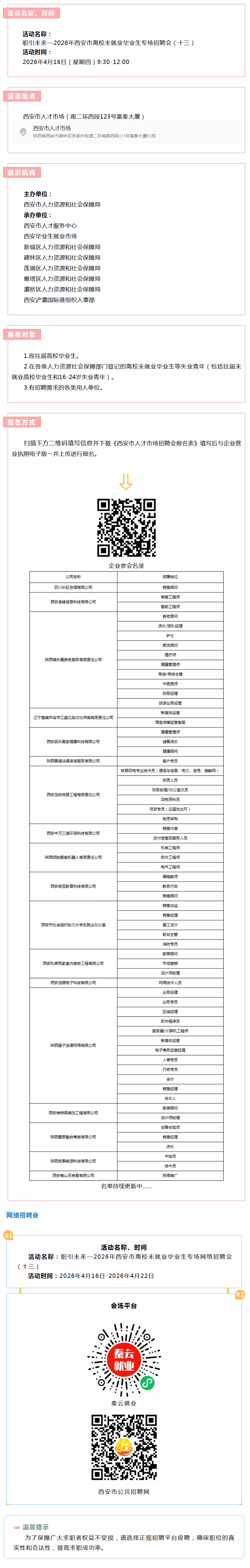 相约4月16日!专场招聘会助力追梦人觅得心仪工作 2026年04月14日 次 上一篇:直播预告|雁阵同行 乐业雁塔——雁塔区2026年职播间直播带岗系列活动(西安慧创科技园专场)本周三10点“职”等你来! 下一篇:【招聘活动】600+用人单位,17000余个优质岗位!4月15日中国西安人才市场招聘活动,重磅来袭!