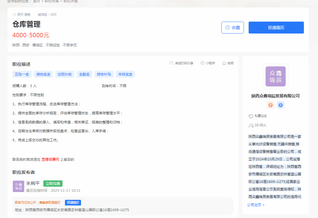 陕西众鑫瑞辰贸易有限公司 2024年09月17日 次 应聘网址:https://www.xbjob.com/job/47685.html 上一篇:陕西众鑫瑞辰贸易有限公司招聘会计 下一篇:中国水电三局2024校园招聘公告